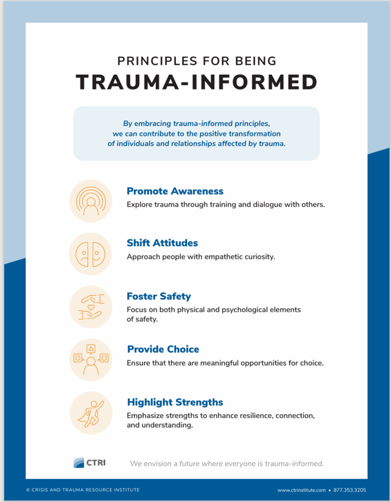 CTRI. (n.d.) Principles for being trauma-informed. Crisis and Trauma Resource Institute. Retrieved from.Trauma Informed Care Poster v3